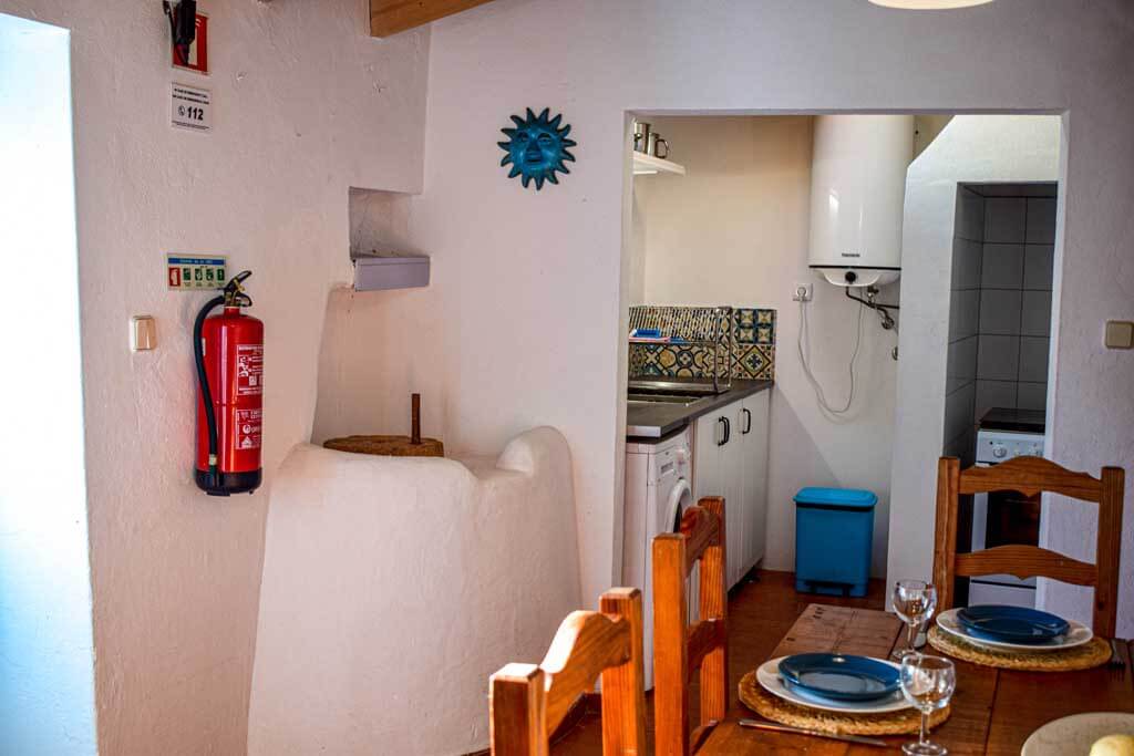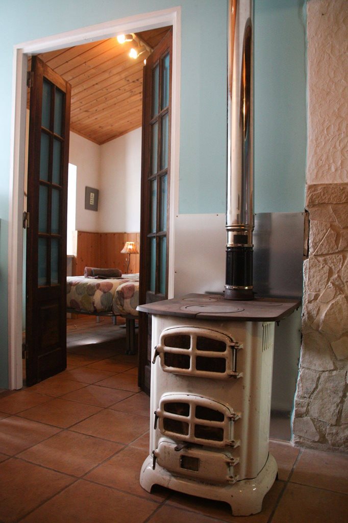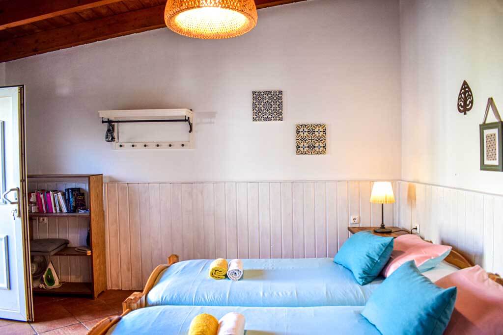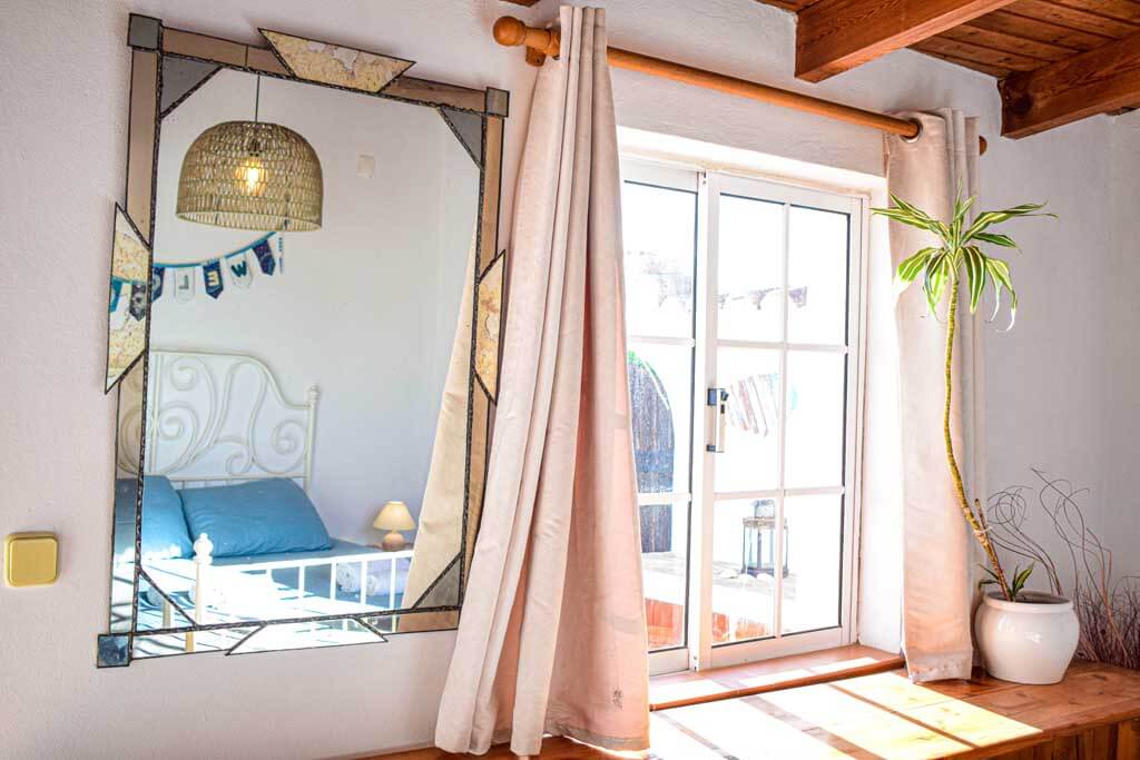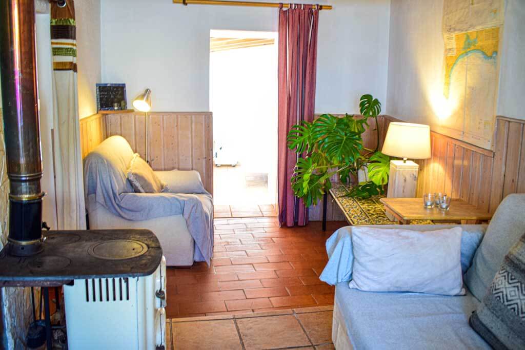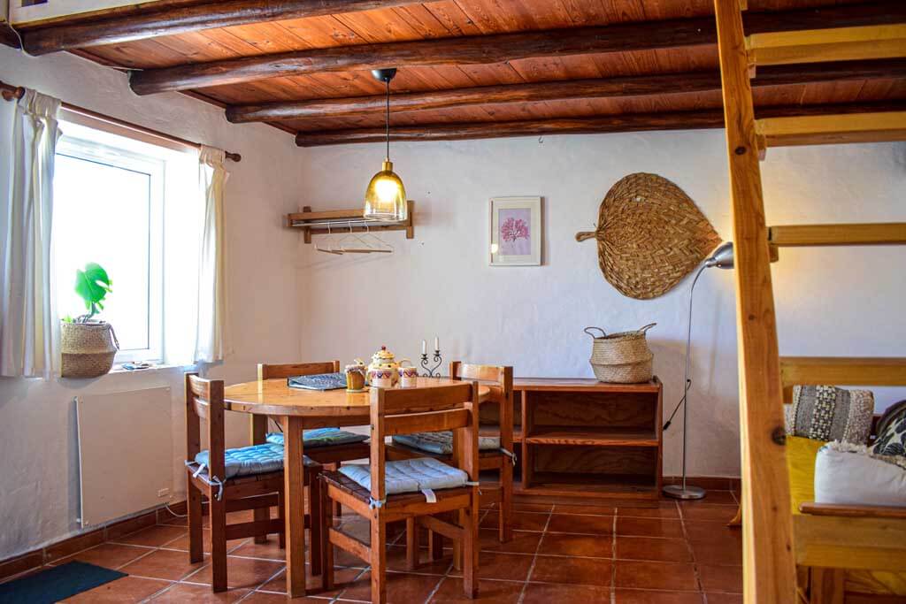 This is a two bedroom cottage and can sleep 5. The master bedroom is spacious and light with a comfortable double bed. The second bedroom with it’s blue shutters and blue wall gives you a South-European feeling. In the living room is a single sofa bed for a possible 5th guest. It has a traditional Portuguese kitchen with all you need to prepare some home-made meals during your stay, including a washing machine and oven. A private terrace with plenty of space to eat outside with the family and an outside sink. The house is an old farm but beautifully restored. You can see its characteristics in the wide walls and old grain mill in the kitchen. The living room is fitted with a log burner which keeps the house nice and warm especially for off-season guests.