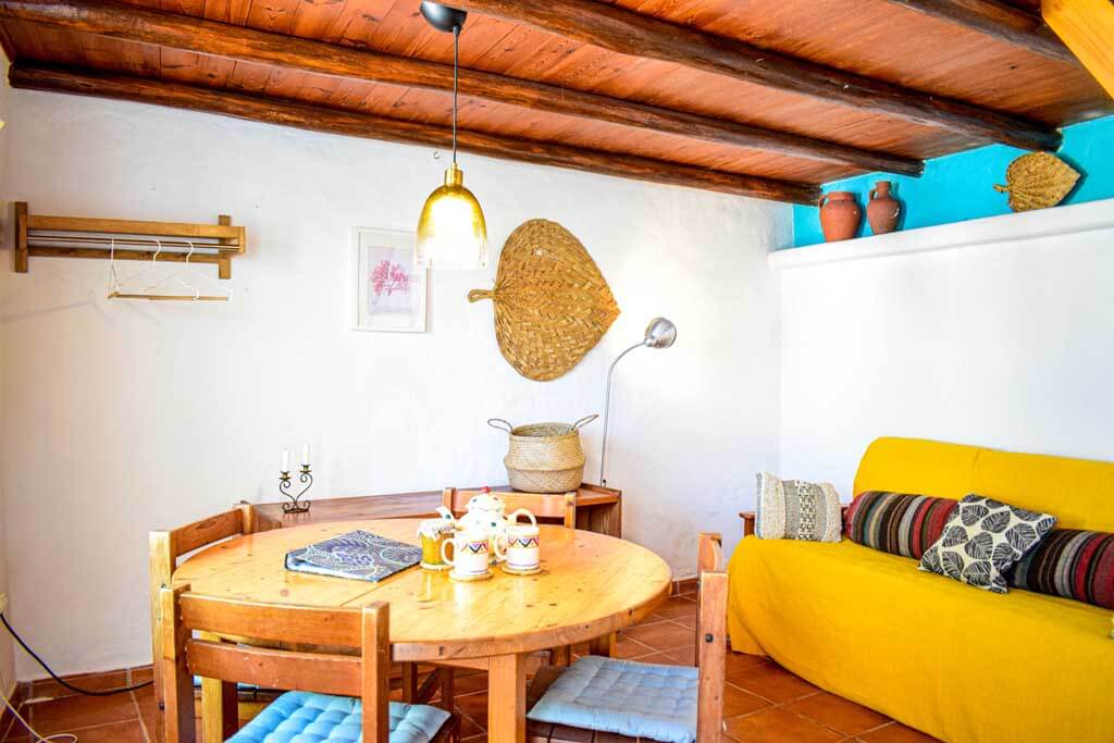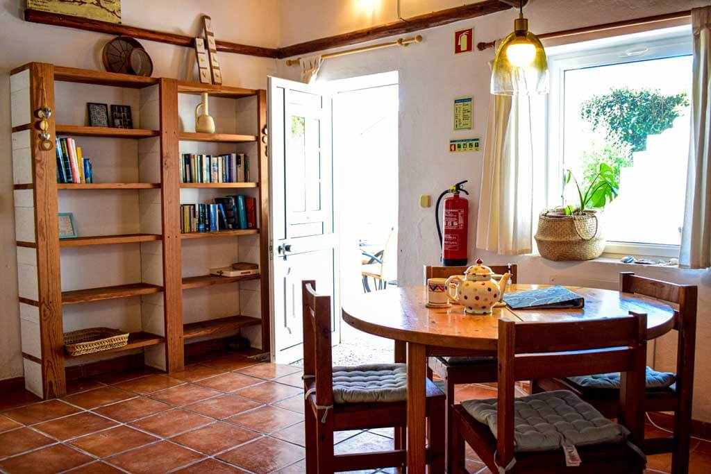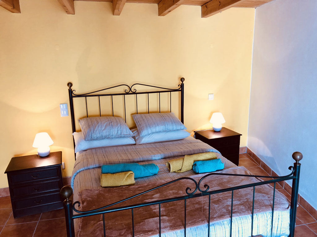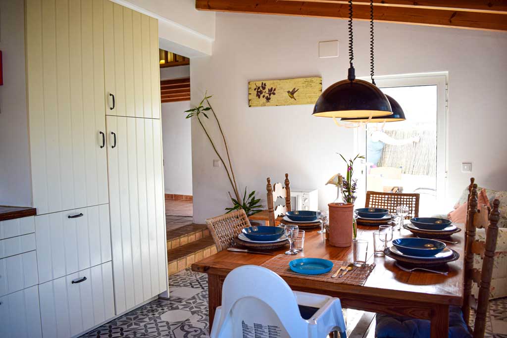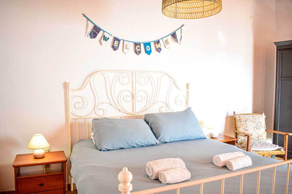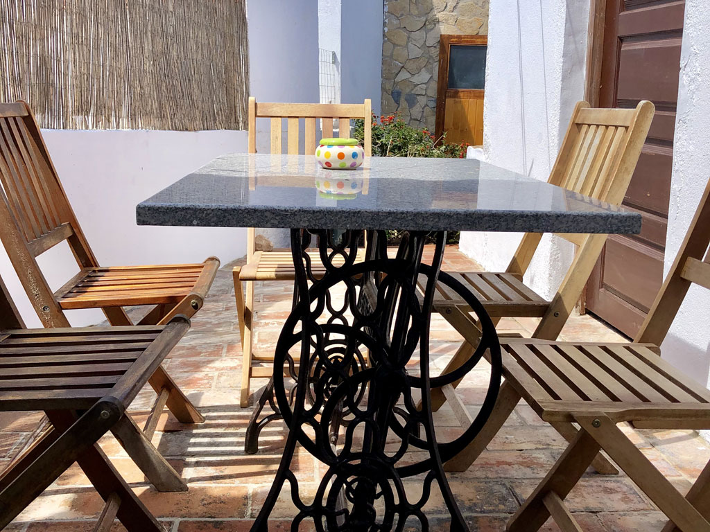 This is a two bedroom cottage and can sleep 5. The master bedroom is spacious and light with a comfortable double bed. The second bedroom with it’s blue shutters and blue wall gives you a South-European feeling. In the living room is a single sofa bed for a possible 5th guest. It has a traditional Portuguese kitchen with all you need to prepare some home-made meals during your stay, including a washing machine and oven. A private terrace with plenty of space to eat outside with the family and an outside sink. The house is an old farm but beautifully restored. You can see its characteristics in the wide walls and old grain mill in the kitchen. The living room is fitted with a log burner which keeps the house nice and warm especially for off-season guests.