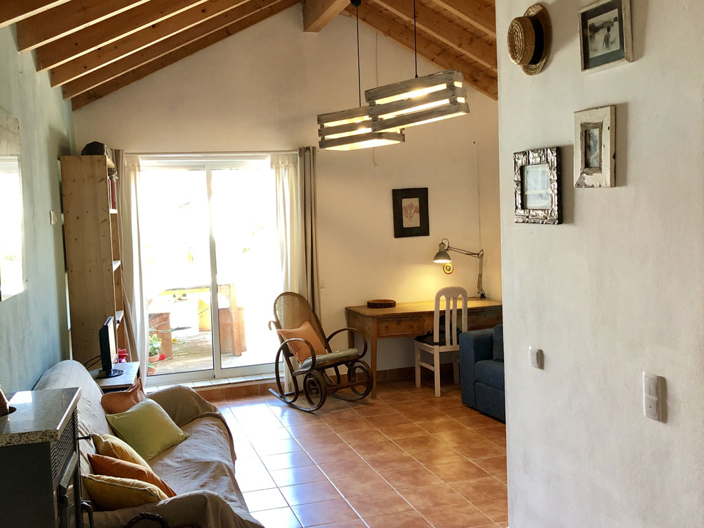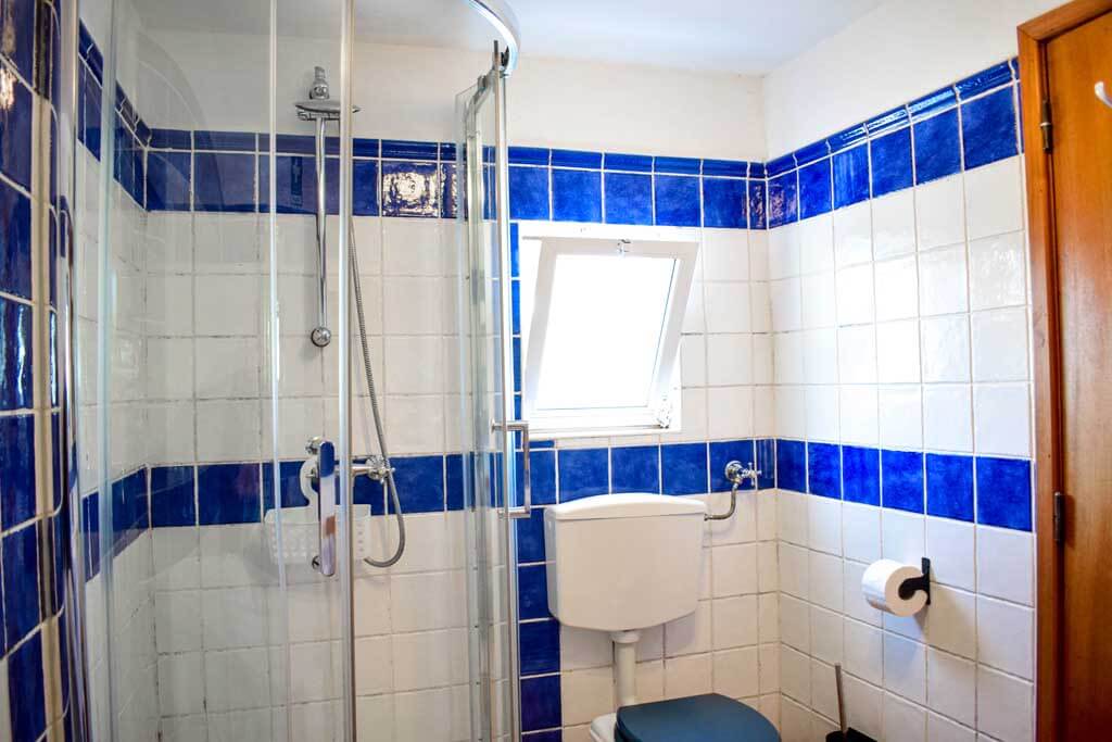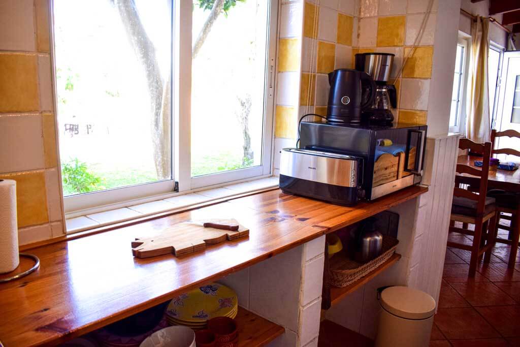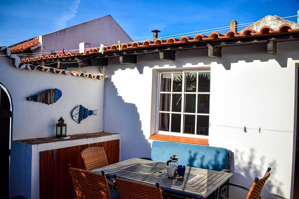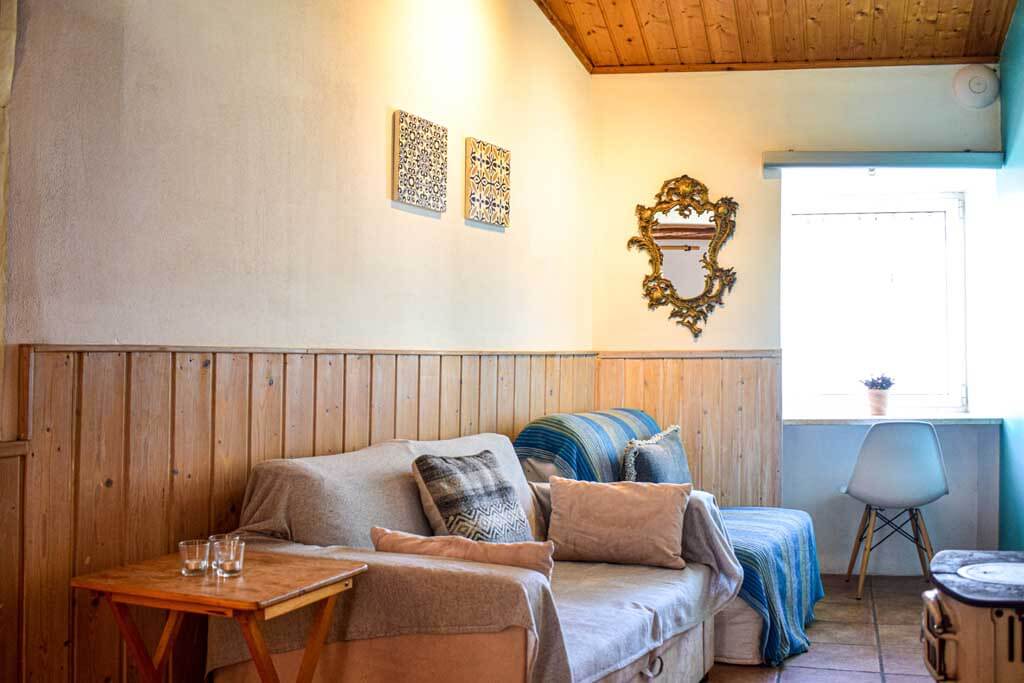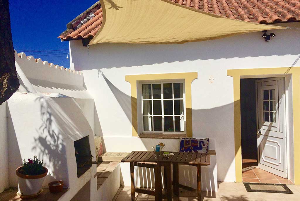 Originally a donkey stables, now a lovely holiday home. Entering the house into the large, spacious open kitchen. With authentic Portuguese tiles and a 5 hob, grill and oven cooker. This is the perfect house for people who love to cook. The bathroom is large with 2 sinks and a big shower. There is one good size bedroom with a double bed. Then there is a mezzanine bedroom with roof window which has two single beds. It is under the gable roof, high enough to kneel, sit and sleep. More suitable for kids. There is a sturdy ladder going up and a rail for protection. The living room is kitted out with a comfortable large 160×200 sofa-bed, suitable for two. There is a private terrace in the back and another terrace in the front with bbq and pizza oven area.