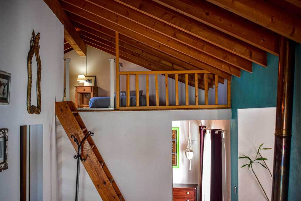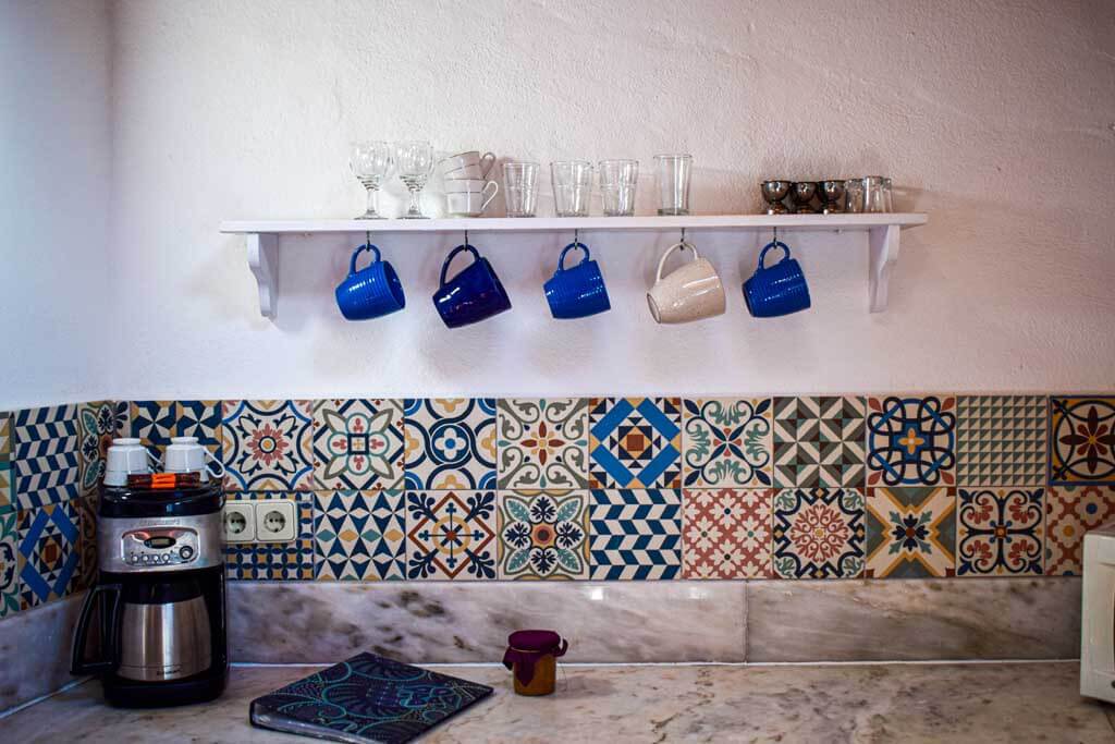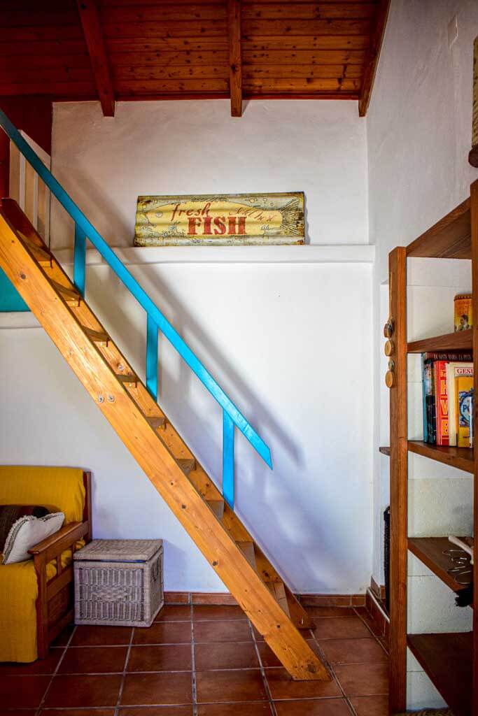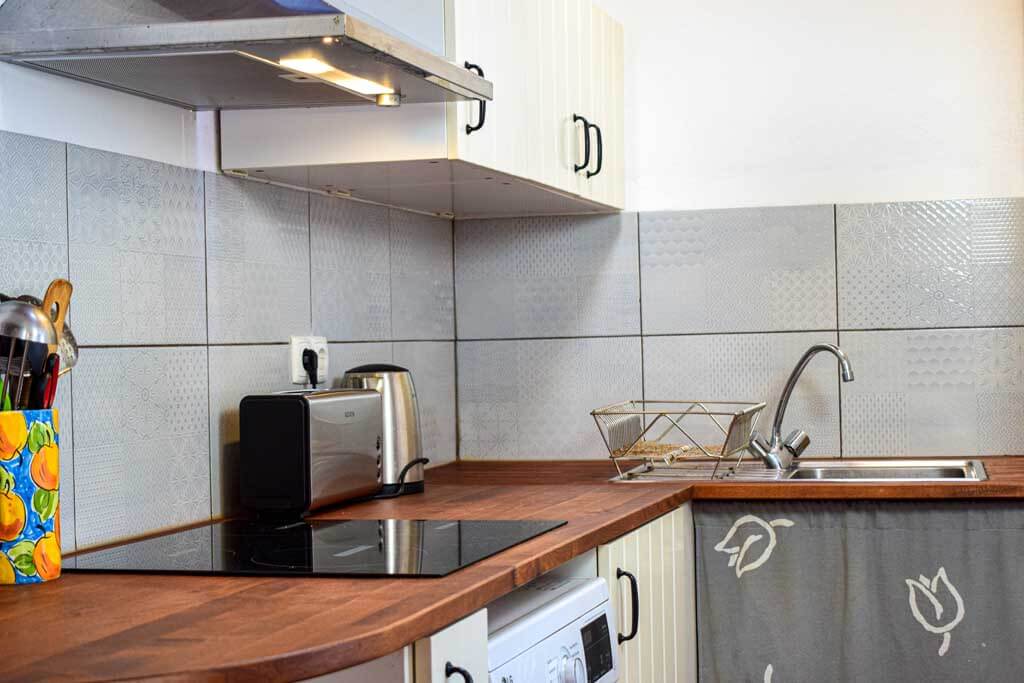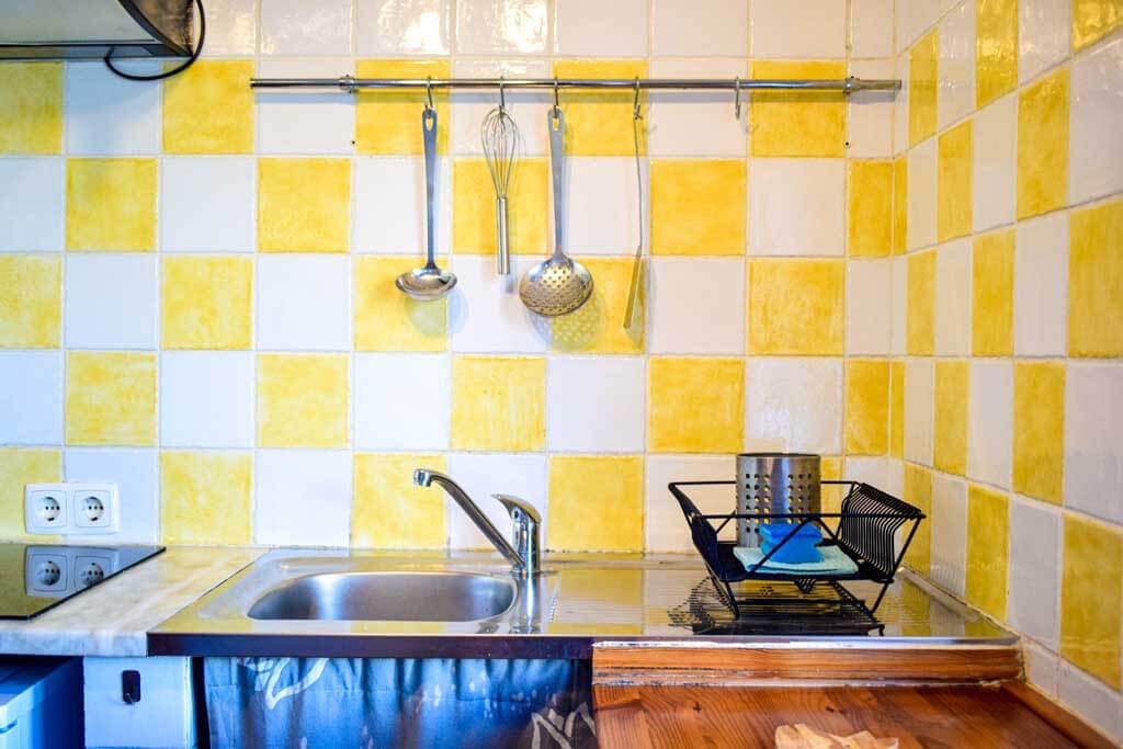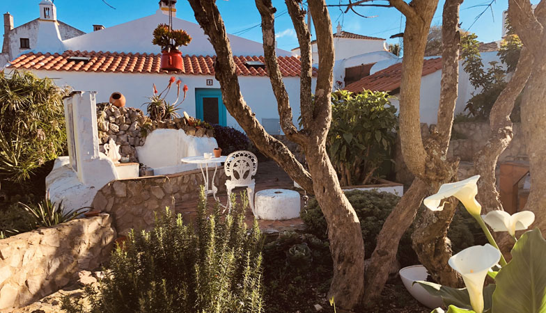 Originally a donkey stables, now a lovely holiday home. Entering the house into the large, spacious open kitchen. With authentic Portuguese tiles and a 5 hob, grill and oven cooker. This is the perfect house for people who love to cook. The bathroom is large with 2 sinks and a big shower. There is one good size bedroom with a double bed. Then there is a mezzanine bedroom with roof window which has two single beds. It is under the gable roof, high enough to kneel, sit and sleep. More suitable for kids. There is a sturdy ladder going up and a rail for protection. The living room is kitted out with a comfortable large 160×200 sofa-bed, suitable for two. There is a private terrace in the back and another terrace in the front with bbq and pizza oven area.